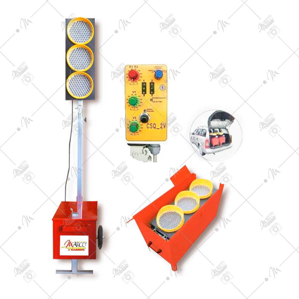 - Sistema de semáforos : 2 semáforos con carro metálico porta-baterías con rueda, 3 luces (Rojo 300 mm. Ámbar 200 mm. y Verde mm), central de control y cables conexión y alimentación.